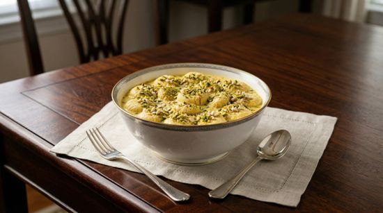 दूसरे बर्तन में 1 लीटर फुल क्रीम दूध उबालें। इसमें 1/2 कप चीनी, 4 कुटी हुई हरी इलायची और 1 बड़ा चम्मच दूध में भिगोए हुए 10 केसर के धागे डालें। 10 मिनट तक धीमी आंच पर पकाएं जब तक कि मिश्रण थोड़ा गाढ़ा न हो जाए।
